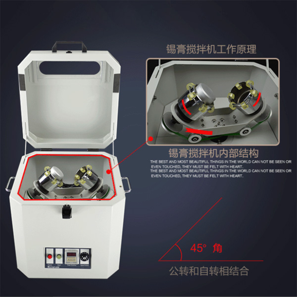 6、密蔽式搅拌能固定运转时间,能保证锡膏柔软(Q性)的稳定度且新旧锡膏混合搅拌,也可获得较活性的新锡膏。